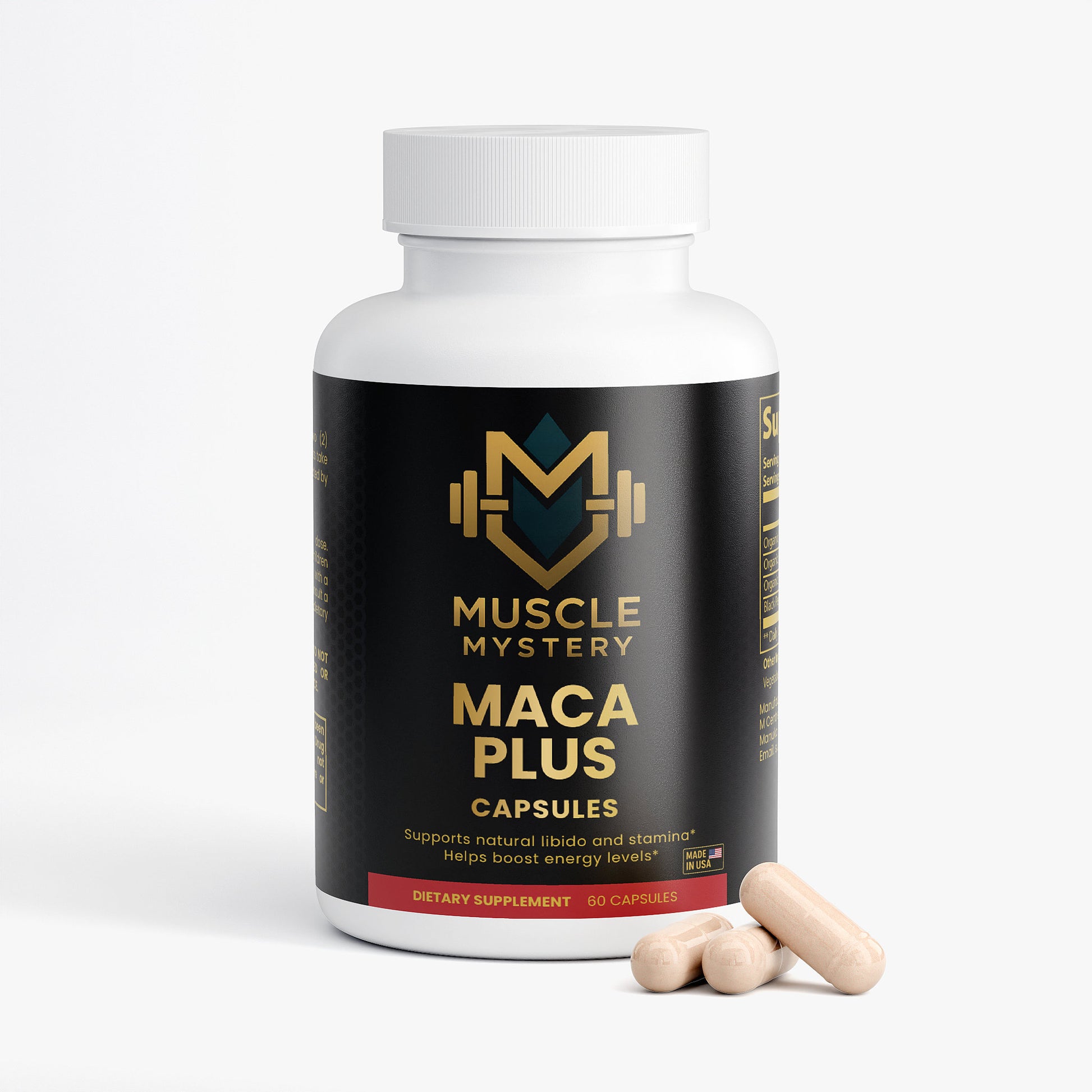 Ingredients: Organic Maca Root (Black), Organic Maca Root (Red), Organic Maca Root (Yellow), Black Pepper, Hypromellose (vegetable capsule), Vegetable Stearate.